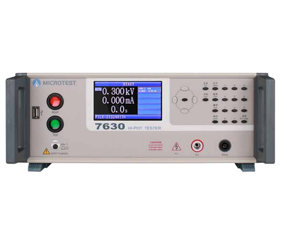 7630為2通道耐壓測(cè)試儀,AC 高壓5000V,DC 高壓6000V,絕緣阻抗1.2G?。內(nèi)部記憶體可存30組測(cè)試檔案,每組檔案支援16組測(cè)試步驟。USB Host 可儲(chǔ)存檔案及更新韌體??蛇B接USB Device/RS-232傳送指令至電腦。另外待測(cè)物測(cè)試不良時(shí),可加裝不良的通道警示燈,透過(guò)Remote Port輸出信號(hào)判斷。耐高壓測(cè)試儀為驗(yàn)證產(chǎn)品的品質(zhì)和電氣安全特性的一種測(cè)試。一般適用于進(jìn)料檢驗(yàn),制程控制,生產(chǎn)線,或研發(fā)等檢測(cè)部門。